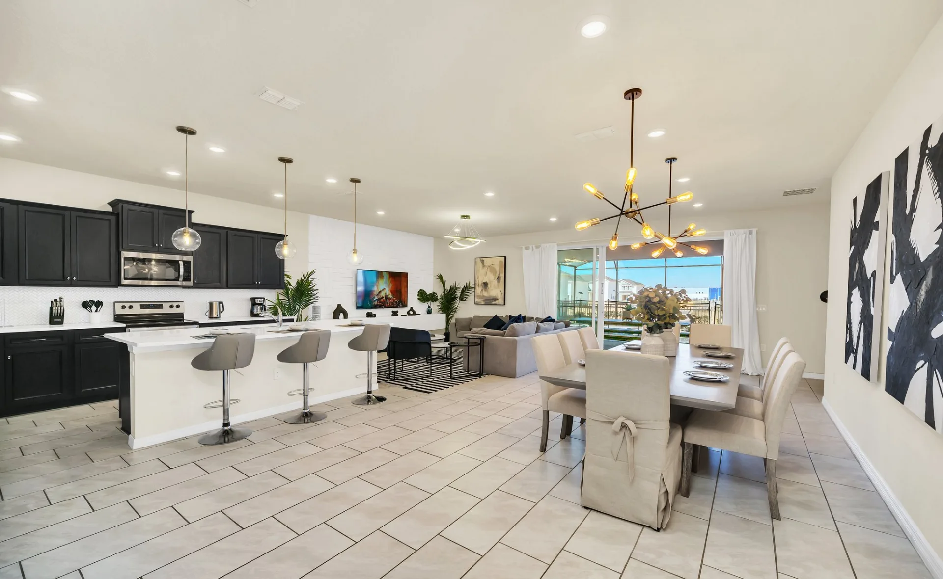 This 10-bedroom luxury villa in the gated Windsor Island Resort is designed for large families and groups, offering the perfect blend of comfort and entertainment. The spacious home includes a fully equipped kitchen with granite countertops, stainless steel appliances, a breakfast island, and a formal dining area ideal for shared meals. Guests can unwind in the open living spaces, enjoy movie nights in the private theater, or have fun in the Harry Potter–themed game room with a pool table and arcade games, as well as an upstairs loft featuring foosball, air hockey, and more. Outside, the screened-in pool area offers sun loungers, patio seating, and a child safety fence—perfect for soaking up the Florida sunshine. With themed bedrooms, multiple king and queen suites, and plenty of twin rooms for the kids, this elegant getaway ensures everyone feels right at home.